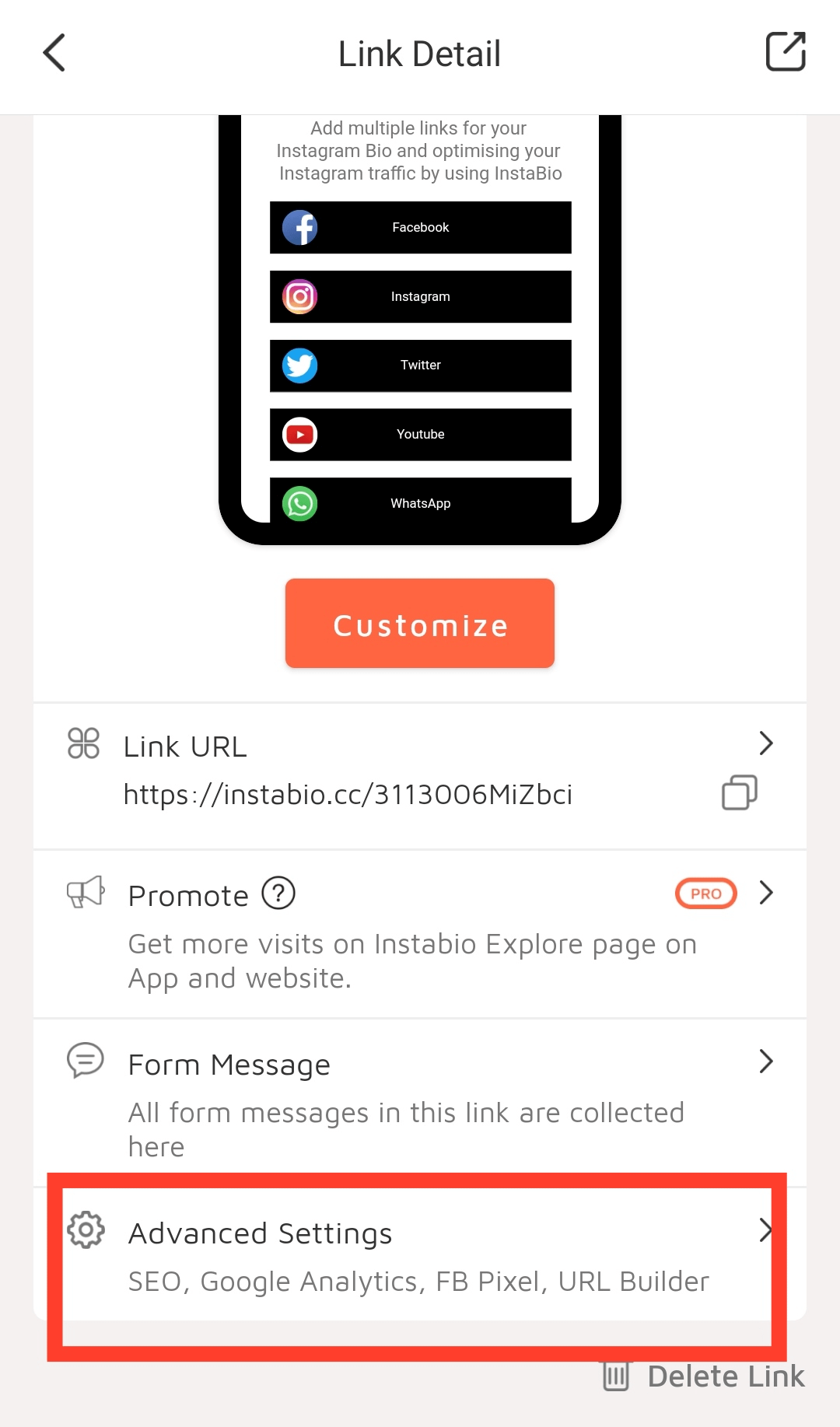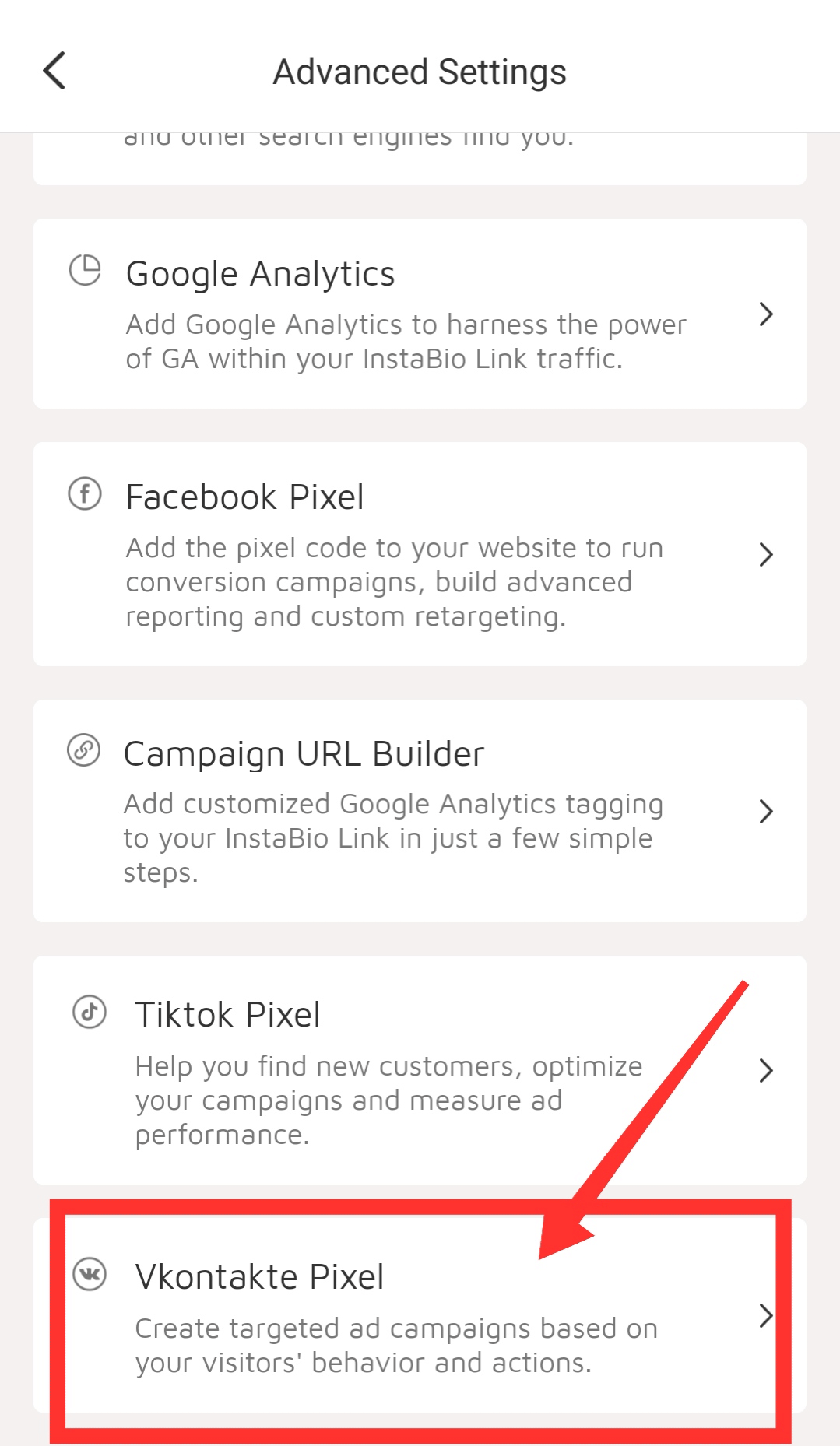 5. Log in to Instabio, click the link, scroll to the bottom on the link details page, click Advanced Settings -> VKontakte Pixel)
