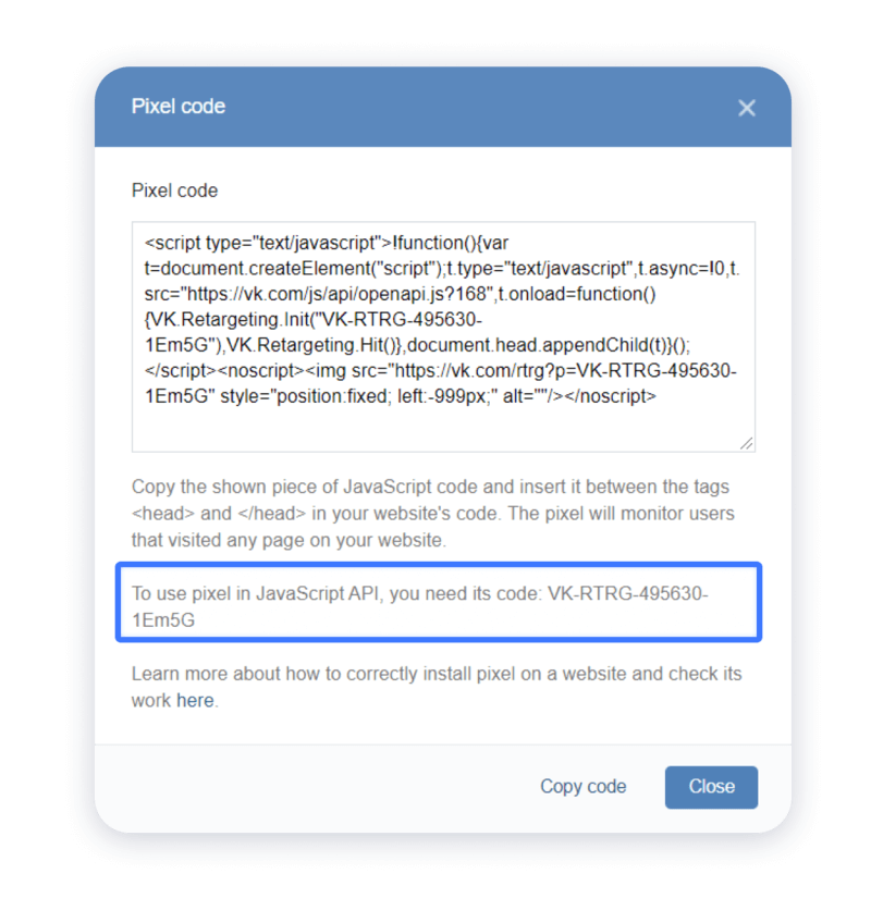 4. Copy the unique code next to To use pixel in JavaScript API, you need its code