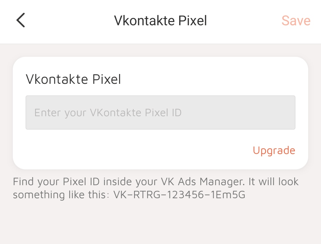 6. Click "Enter your VKontakte pixel ID" and remember to click "Save" when finished.