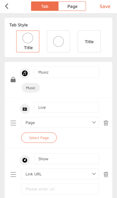 You can choose one tab style to display on the landing page. Click "+ Add Tab" to add new tabs.