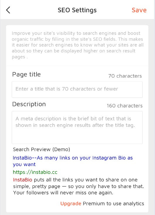 Enter a description for the search engine listing. Make sure to include relevant keywords to help new fans or customers find your link, and to include your brand name. Use natural, readable phrases, rather than lists of keywords. You can enter up to 160 characters in the description.