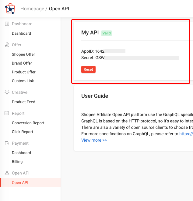 1. Go to your Shopee Affiliate Homepage, click "Open API" section.